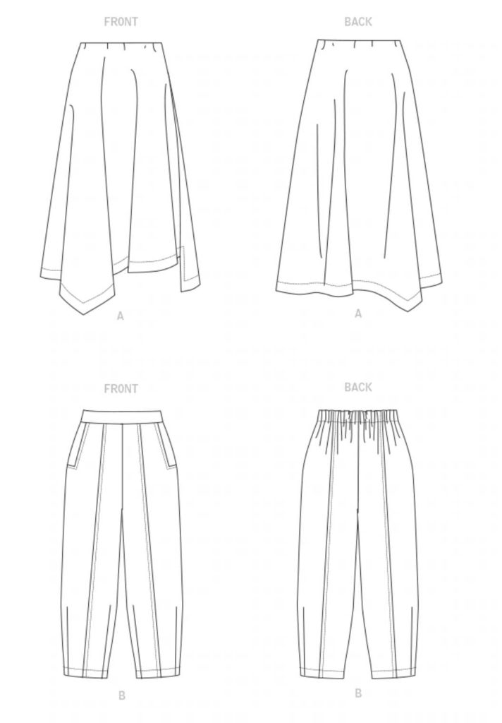 A: Bias cut knit skirt, asymmetrical hem, elastic waist, can be worn front to back. B: Cropped pants with side front pockets, flat front, darts at hem.